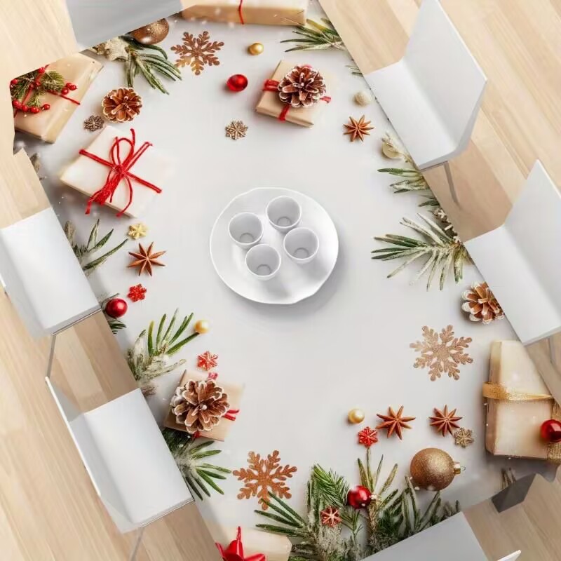 DURABLE POLYESTER - Crafted from high-quality polyester, this tablecloth is built to last through many festive seasons. Its strong and resilient fabric resists wear and tear, maintaining its shape and appearance even after frequent use. Whether hosting large family dinners or small holiday gatherings, this tablecloth provides reliable coverage and protection for your table, ensuring it looks great year after year.